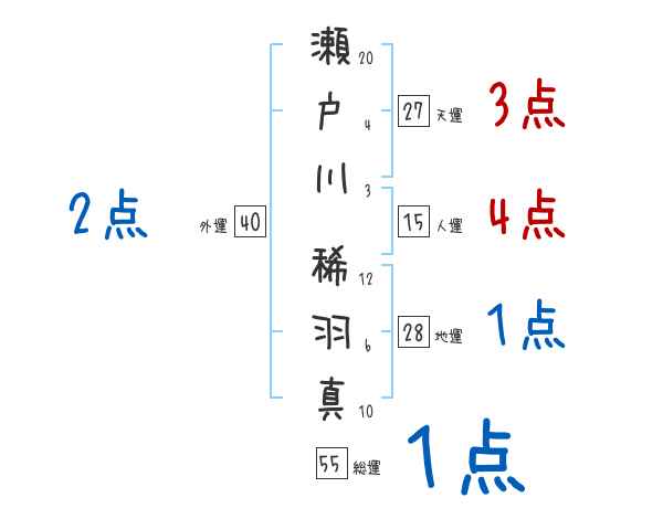 瀬戸川稀羽真さんの総運は55画の1つ星