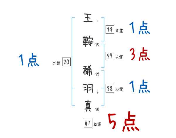 総運![]() | 王鞍稀羽真さんの総運は47画の5つ星!実力が開花し発展する円満な人生。財に恵まれる。 あなたの人生を表す1番重要な運勢です。生涯を通じて影響する総合運となり、主に50歳以降の晩年期に影響を及ぼします。 |