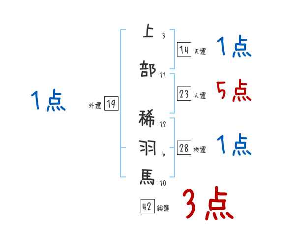 天運![]() | 上部稀羽馬さんの天運は14画の1つ星!人に対して優しいがストレスを溜め込みがち。人間関係のトラブルを避けるよう気をつけましょう。 家系が持つ宿命的な運勢を表します。祖先から受け継いだ苗字ですので自分の力が及びません。家柄を象徴します。 |