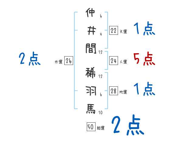 天運![]() | 仲井間稀羽馬さんの天運は22画の1つ星!努力することが苦手ないっぽう手先が器用。芸術性にも優れる。 家系が持つ宿命的な運勢を表します。祖先から受け継いだ苗字ですので自分の力が及びません。家柄を象徴します。 |