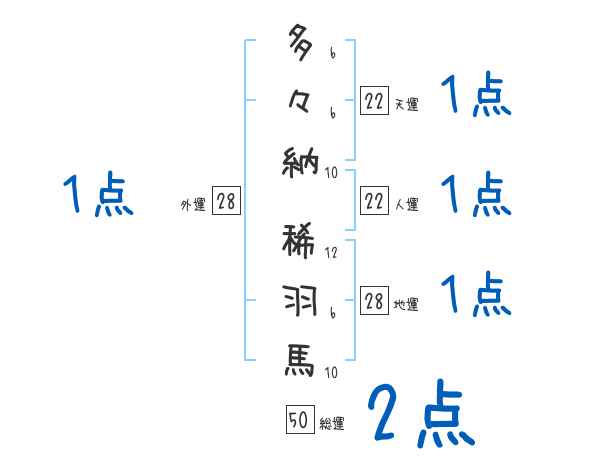 地運![]() | 多々納稀羽馬さんの地運は28画の1つ星!家庭環境に注意。スポーツで活躍できる能力があるかも。 個性を表す基礎的な運勢です。性格形成や対人関係、行動力など家庭環境に影響されます。主に誕生してから20歳くらいまでの若年期の運勢を表します。 |