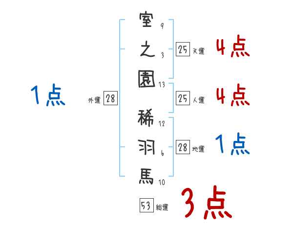 外運![]() | 室之園稀羽馬さんの外運は28画の1つ星!家庭環境に注意。スポーツで活躍できる能力があるかも。 生活面を象徴する運勢です。外部から受ける影響力を表し、結婚運、家庭運や職場、環境への順応性を表します。 |