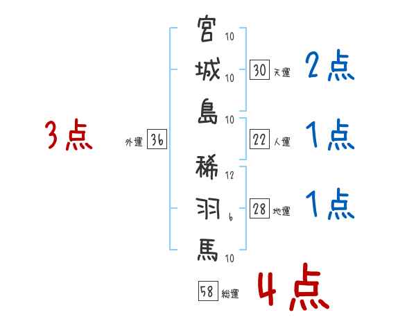 天運![]() | 宮城島稀羽馬さんの天運は30画の2つ星!浮き沈みの激しさに注意しましょう。 家系が持つ宿命的な運勢を表します。祖先から受け継いだ苗字ですので自分の力が及びません。家柄を象徴します。 |