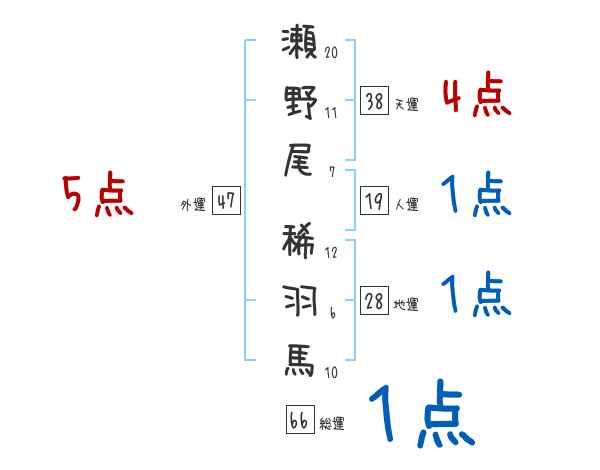 瀬野尾稀羽馬さんの画数の鑑定結果