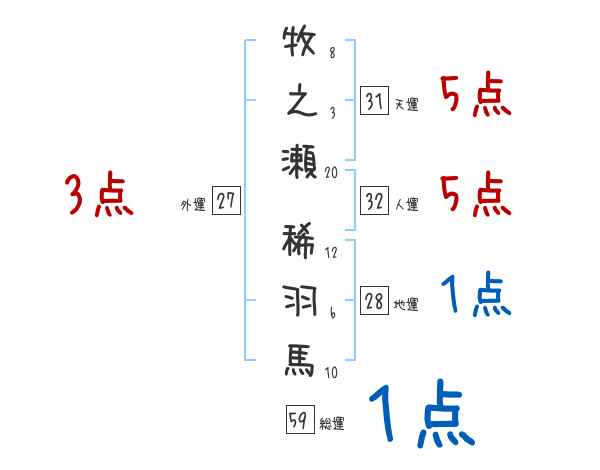牧之瀬稀羽馬さんの画数の鑑定結果