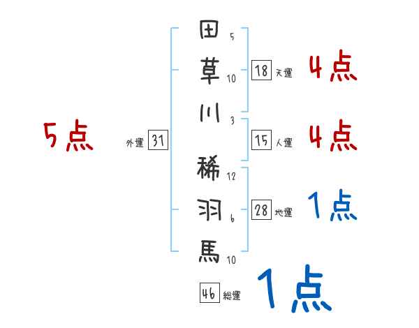 天運![]() | 田草川稀羽馬さんの天運は18画の4つ星!情熱的で剛気。忍耐力があり信頼される。 家系が持つ宿命的な運勢を表します。祖先から受け継いだ苗字ですので自分の力が及びません。家柄を象徴します。 |