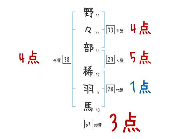 天運![]() | 野々部稀羽馬さんの天運は33画の4つ星!権力志向でプライドが高い。勇気があり運を切り開き成功する。 家系が持つ宿命的な運勢を表します。祖先から受け継いだ苗字ですので自分の力が及びません。家柄を象徴します。 |