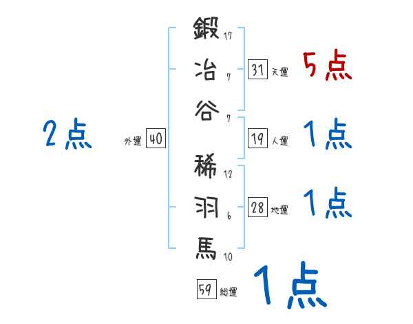 鍛冶谷稀羽馬さんの画数の鑑定結果