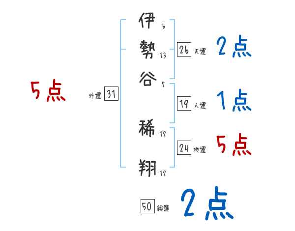 天運![]() | 伊勢谷稀翔さんの天運は26画の2つ星!波瀾万丈かも。信頼できる人を大事にしましょう。 家系が持つ宿命的な運勢を表します。祖先から受け継いだ苗字ですので自分の力が及びません。家柄を象徴します。 |