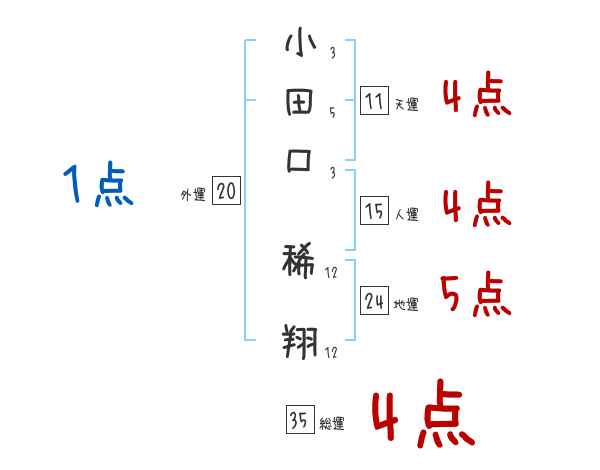 天運![]() | 小田口稀翔さんの天運は11画の4つ星!着実に富や地位を得る幸運な人生。 家系が持つ宿命的な運勢を表します。祖先から受け継いだ苗字ですので自分の力が及びません。家柄を象徴します。 |