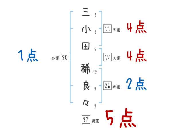 天運![]() | 三小田稀良々さんの天運は11画の4つ星!着実に富や地位を得る幸運な人生。 家系が持つ宿命的な運勢を表します。祖先から受け継いだ苗字ですので自分の力が及びません。家柄を象徴します。 |