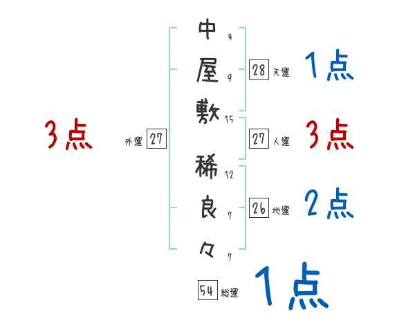人運![]() | 中屋敷稀良々さんの人運は27画の3つ星!頭脳明晰だが強情で摩擦が多い傾向。孤立に注意。 性格や才能などを表す2番目に重要な運勢です。人間関係や協調性、社会的な成功に影響します。主に20歳から50歳ぐらいまでの中年期の運勢を表します。 |