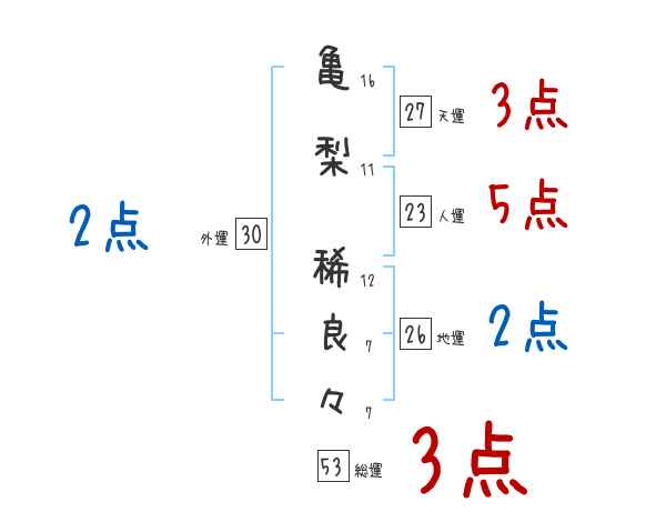 総運![]() | 亀梨稀良々さんの総運は53画の3つ星!やや見栄っ張りで虚栄心がある。散財に注意。 あなたの人生を表す1番重要な運勢です。生涯を通じて影響する総合運となり、主に50歳以降の晩年期に影響を及ぼします。 |