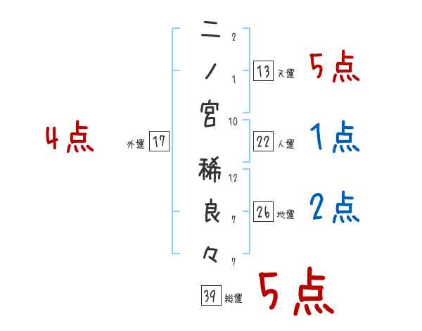 外運![]() | 二ノ宮稀良々さんの外運は17画の4つ星!積極的な行動力。地位を気づき財産を手に入れる。純粋な心と直感力。 生活面を象徴する運勢です。外部から受ける影響力を表し、結婚運、家庭運や職場、環境への順応性を表します。 |