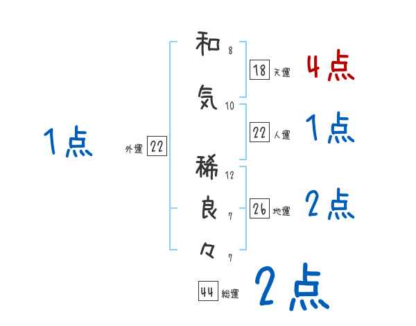 総運![]() | 和気稀良々さんの総運は44画の2つ星!誠実で慎重な性格。物事を考えすぎないように注意しましょう。 あなたの人生を表す1番重要な運勢です。生涯を通じて影響する総合運となり、主に50歳以降の晩年期に影響を及ぼします。 |