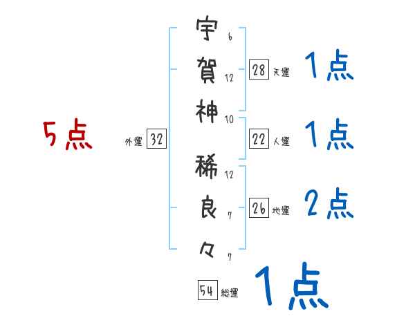 外運![]() | 宇賀神稀良々さんの外運は32画の5つ星!柔軟性があり成功する。チャンスが多く金運が良い。 生活面を象徴する運勢です。外部から受ける影響力を表し、結婚運、家庭運や職場、環境への順応性を表します。 |