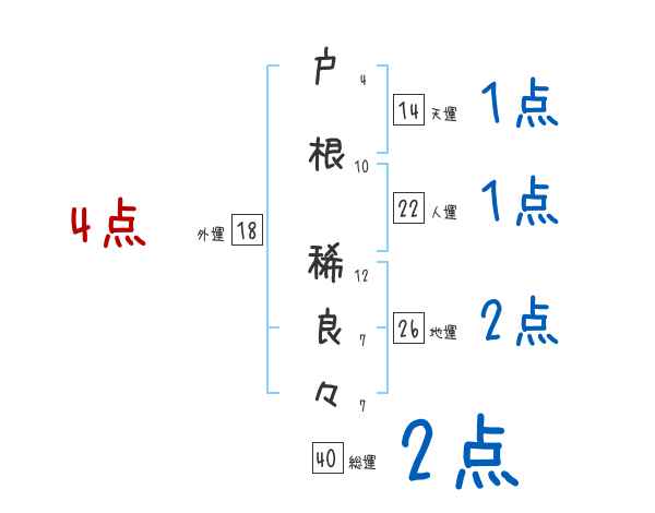 天運![]() | 戸根稀良々さんの天運は14画の1つ星!人に対して優しいがストレスを溜め込みがち。人間関係のトラブルを避けるよう気をつけましょう。 家系が持つ宿命的な運勢を表します。祖先から受け継いだ苗字ですので自分の力が及びません。家柄を象徴します。 |