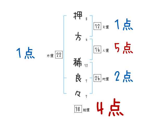 天運![]() | 押方稀良々さんの天運は12画の1つ星!簡単な失敗で諦めてしまいやすいかも。着実に行動すると良いでしょう。 家系が持つ宿命的な運勢を表します。祖先から受け継いだ苗字ですので自分の力が及びません。家柄を象徴します。 |