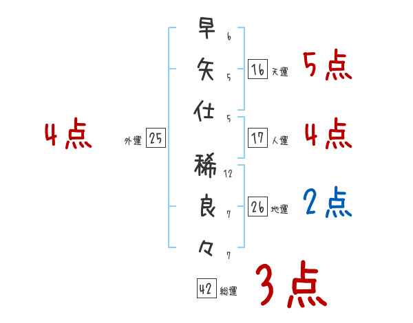 天運![]() | 早矢仕稀良々さんの天運は16画の5つ星!人望が厚く大きく発展する。逆転成功が見える。 家系が持つ宿命的な運勢を表します。祖先から受け継いだ苗字ですので自分の力が及びません。家柄を象徴します。 |