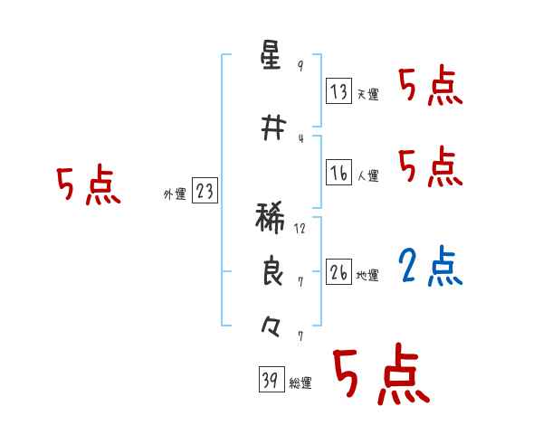 総運![]() | 星井稀良々さんの総運は39画の5つ星!社交性に優れ人望が厚い。人の上に立ち成功する。 あなたの人生を表す1番重要な運勢です。生涯を通じて影響する総合運となり、主に50歳以降の晩年期に影響を及ぼします。 |