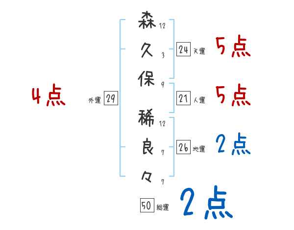 天運![]() | 森久保稀良々さんの天運は24画の5つ星!家庭運が良く順調な人生。金運にも恵まれる。 家系が持つ宿命的な運勢を表します。祖先から受け継いだ苗字ですので自分の力が及びません。家柄を象徴します。 |