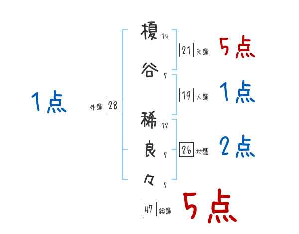 天運![]() | 榎谷稀良々さんの天運は21画の5つ星!統率力がある。独立し成功する。名誉を手に入れる。 家系が持つ宿命的な運勢を表します。祖先から受け継いだ苗字ですので自分の力が及びません。家柄を象徴します。 |