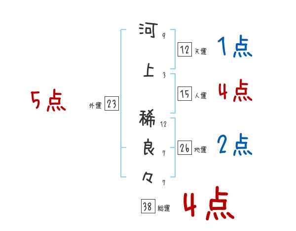 天運![]() | 河上稀良々さんの天運は12画の1つ星!簡単な失敗で諦めてしまいやすいかも。着実に行動すると良いでしょう。 家系が持つ宿命的な運勢を表します。祖先から受け継いだ苗字ですので自分の力が及びません。家柄を象徴します。 |