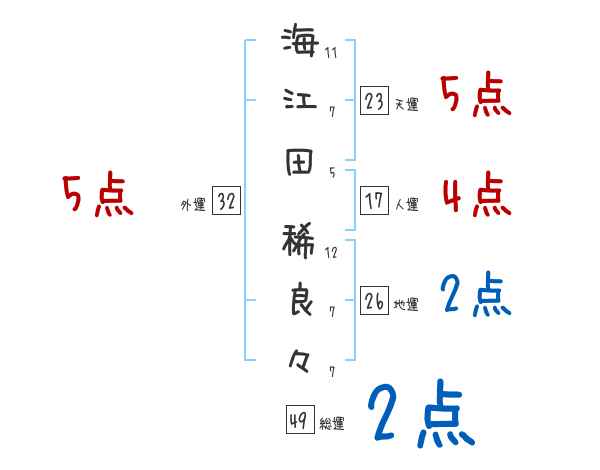 外運![]() | 海江田稀良々さんの外運は32画の5つ星!柔軟性があり成功する。チャンスが多く金運が良い。 生活面を象徴する運勢です。外部から受ける影響力を表し、結婚運、家庭運や職場、環境への順応性を表します。 |