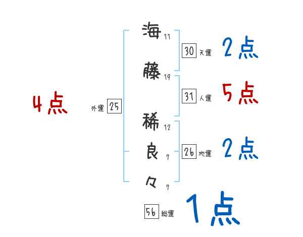 天運![]() | 海藤稀良々さんの天運は30画の2つ星!浮き沈みの激しさに注意しましょう。 家系が持つ宿命的な運勢を表します。祖先から受け継いだ苗字ですので自分の力が及びません。家柄を象徴します。 |