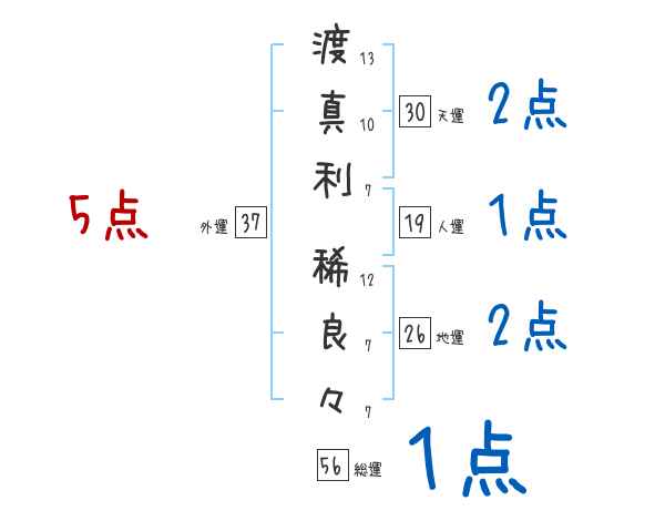 天運![]() | 渡真利稀良々さんの天運は30画の2つ星!浮き沈みの激しさに注意しましょう。 家系が持つ宿命的な運勢を表します。祖先から受け継いだ苗字ですので自分の力が及びません。家柄を象徴します。 |