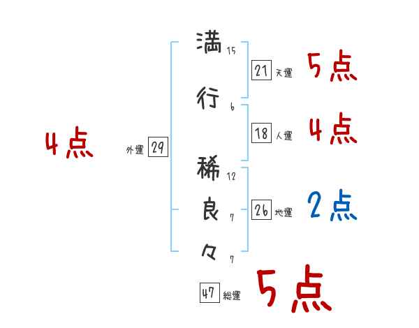 外運![]() | 満行稀良々さんの外運は29画の4つ星!完全主義で才能がある。厳格な心の持ち主。 生活面を象徴する運勢です。外部から受ける影響力を表し、結婚運、家庭運や職場、環境への順応性を表します。 |
