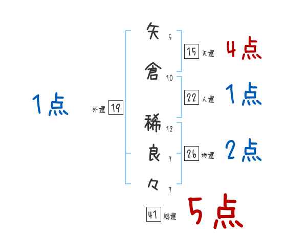 外運![]() | 矢倉稀良々さんの外運は19画の1つ星!優れた才能を持ちますが、協調性が足りないことも。周りの人と協力する事を意識しましょう。 生活面を象徴する運勢です。外部から受ける影響力を表し、結婚運、家庭運や職場、環境への順応性を表します。 |