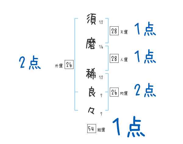 天運![]() | 須磨稀良々さんの天運は28画の1つ星!家庭環境に注意。スポーツで活躍できる能力があるかも。 家系が持つ宿命的な運勢を表します。祖先から受け継いだ苗字ですので自分の力が及びません。家柄を象徴します。 |