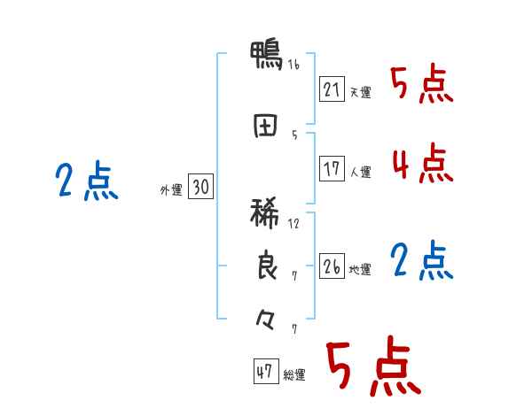 天運![]() | 鴨田稀良々さんの天運は21画の5つ星!統率力がある。独立し成功する。名誉を手に入れる。 家系が持つ宿命的な運勢を表します。祖先から受け継いだ苗字ですので自分の力が及びません。家柄を象徴します。 |