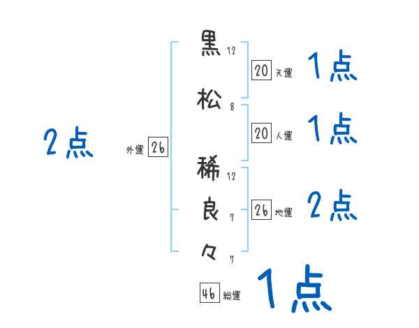 地運![]() | 黒松稀良々さんの地運は26画の2つ星!波瀾万丈かも。信頼できる人を大事にしましょう。 個性を表す基礎的な運勢です。性格形成や対人関係、行動力など家庭環境に影響されます。主に誕生してから20歳くらいまでの若年期の運勢を表します。 |