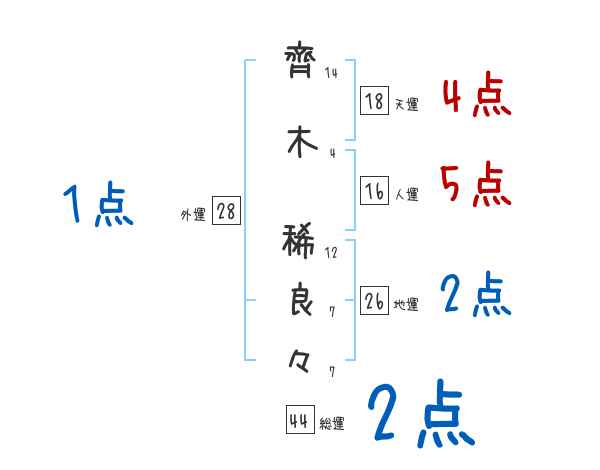 天運![]() | 齊木稀良々さんの天運は18画の4つ星!情熱的で剛気。忍耐力があり信頼される。 家系が持つ宿命的な運勢を表します。祖先から受け継いだ苗字ですので自分の力が及びません。家柄を象徴します。 |