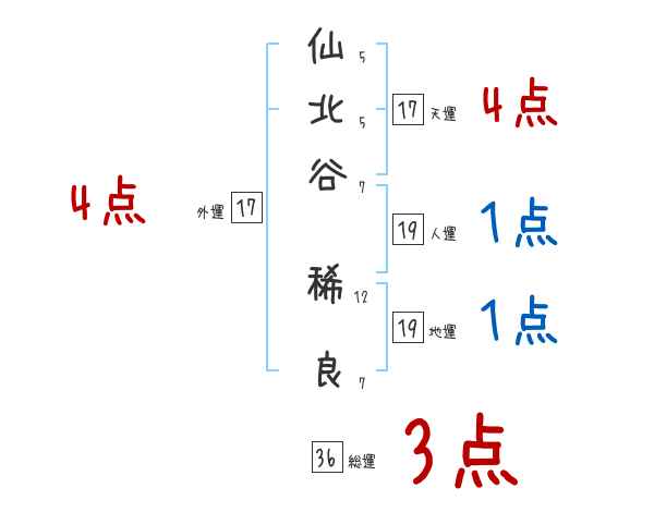 総運![]() | 仙北谷稀良さんの総運は36画の3つ星!先見性が豊かです。多少神経質で苦労することも。 あなたの人生を表す1番重要な運勢です。生涯を通じて影響する総合運となり、主に50歳以降の晩年期に影響を及ぼします。 |