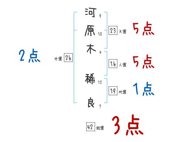 人運![]() | 河原木稀良さんの人運は16画の5つ星!人望が厚く大きく発展する。逆転成功が見える。 性格や才能などを表す2番目に重要な運勢です。人間関係や協調性、社会的な成功に影響します。主に20歳から50歳ぐらいまでの中年期の運勢を表します。 |