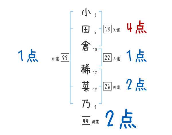 総運![]() | 小田倉稀菜乃さんの総運は44画の2つ星!誠実で慎重な性格。物事を考えすぎないように注意しましょう。 あなたの人生を表す1番重要な運勢です。生涯を通じて影響する総合運となり、主に50歳以降の晩年期に影響を及ぼします。 |