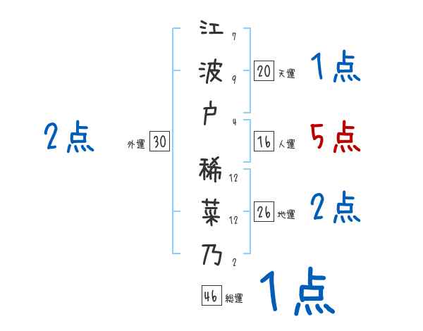 地運![]() | 江波戸稀菜乃さんの地運は26画の2つ星!波瀾万丈かも。信頼できる人を大事にしましょう。 個性を表す基礎的な運勢です。性格形成や対人関係、行動力など家庭環境に影響されます。主に誕生してから20歳くらいまでの若年期の運勢を表します。 |