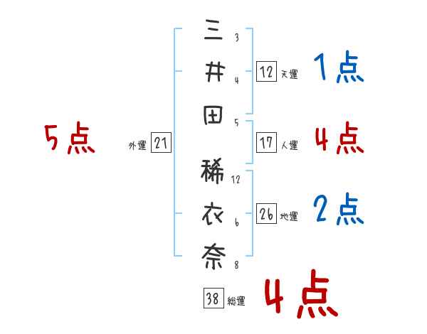 外運![]() | 三井田稀衣奈さんの外運は21画の5つ星!統率力がある。独立し成功する。名誉を手に入れる。 生活面を象徴する運勢です。外部から受ける影響力を表し、結婚運、家庭運や職場、環境への順応性を表します。 |