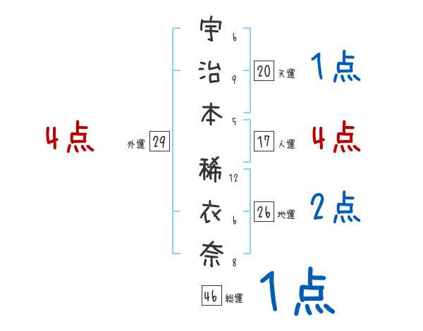 総運![]() | 宇治本稀衣奈さんの総運は46画の1つ星!迷走することが多く苦労するかも。目先のことにとらわれないように。 あなたの人生を表す1番重要な運勢です。生涯を通じて影響する総合運となり、主に50歳以降の晩年期に影響を及ぼします。 |