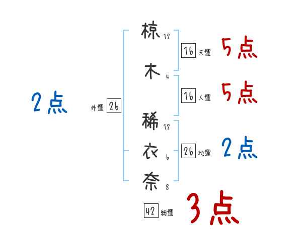 総運![]() | 椋木稀衣奈さんの総運は42画の3つ星!病気に注意。多芸であるが消極的でおとなしい。 あなたの人生を表す1番重要な運勢です。生涯を通じて影響する総合運となり、主に50歳以降の晩年期に影響を及ぼします。 |