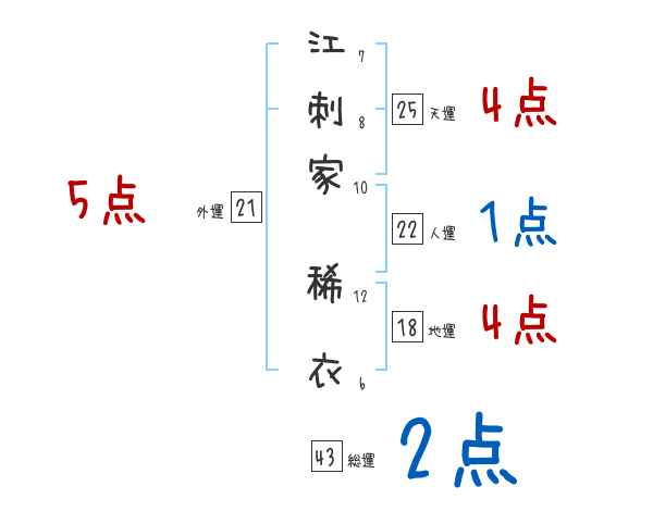 天運![]() | 江刺家稀衣さんの天運は25画の4つ星!個性があり才能があふれる。強運の持ち主で発展する。 家系が持つ宿命的な運勢を表します。祖先から受け継いだ苗字ですので自分の力が及びません。家柄を象徴します。 |