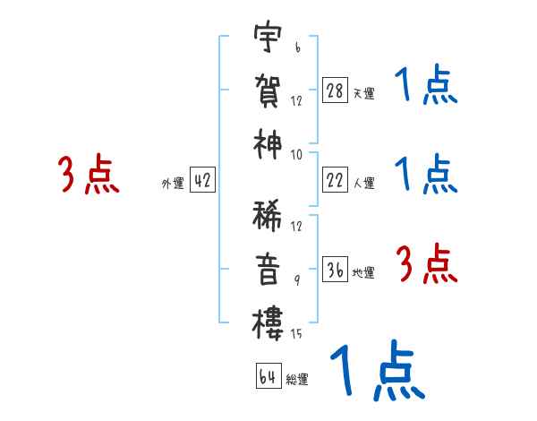 天運![]() | 宇賀神稀音樓さんの天運は28画の1つ星!家庭環境に注意。スポーツで活躍できる能力があるかも。 家系が持つ宿命的な運勢を表します。祖先から受け継いだ苗字ですので自分の力が及びません。家柄を象徴します。 |
