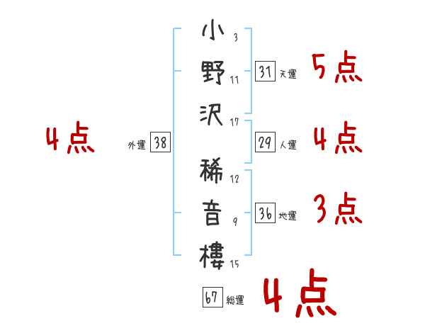 総運![]() | 小野沢稀音樓さんの総運は67画の4つ星!幸運な人生。堅実な性格で調和し、周りの人に助けられる。 あなたの人生を表す1番重要な運勢です。生涯を通じて影響する総合運となり、主に50歳以降の晩年期に影響を及ぼします。 |
