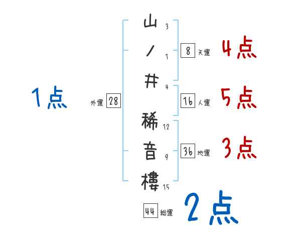 人運![]() | 山ノ井稀音樓さんの人運は16画の5つ星!人望が厚く大きく発展する。逆転成功が見える。 性格や才能などを表す2番目に重要な運勢です。人間関係や協調性、社会的な成功に影響します。主に20歳から50歳ぐらいまでの中年期の運勢を表します。 |
