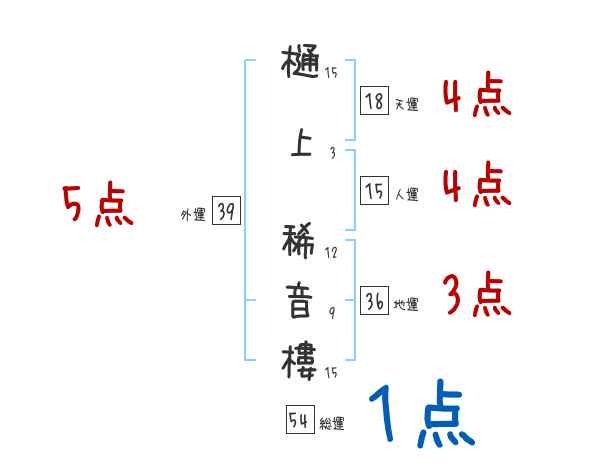 外運![]() | 樋上稀音樓さんの外運は39画の5つ星!社交性に優れ人望が厚い。人の上に立ち成功する。 生活面を象徴する運勢です。外部から受ける影響力を表し、結婚運、家庭運や職場、環境への順応性を表します。 |