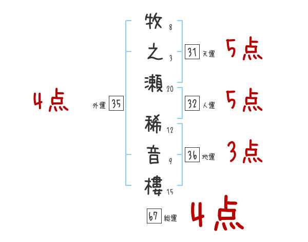 人運![]() | 牧之瀬稀音樓さんの人運は32画の5つ星!柔軟性があり成功する。チャンスが多く金運が良い。 性格や才能などを表す2番目に重要な運勢です。人間関係や協調性、社会的な成功に影響します。主に20歳から50歳ぐらいまでの中年期の運勢を表します。 |