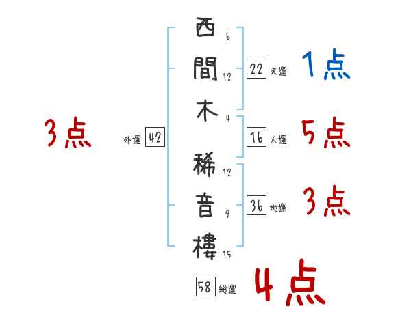 天運![]() | 西間木稀音樓さんの天運は22画の1つ星!努力することが苦手ないっぽう手先が器用。芸術性にも優れる。 家系が持つ宿命的な運勢を表します。祖先から受け継いだ苗字ですので自分の力が及びません。家柄を象徴します。 |